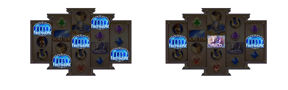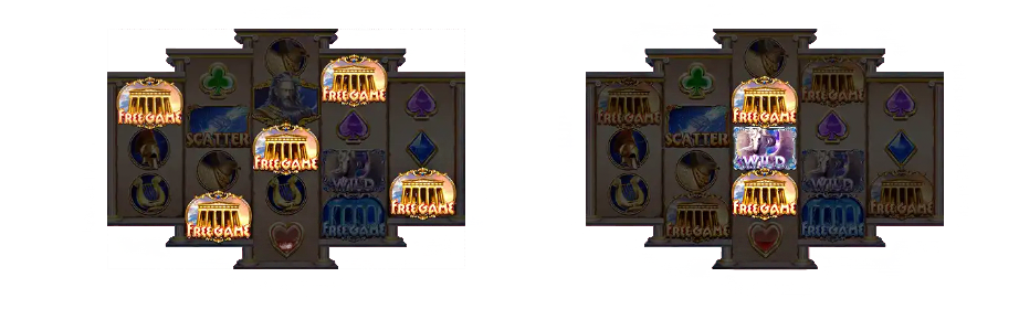 - 在主遊戲中常會出現兩種神殿,「黃金神殿」「藍色神殿」,只要由左至右出現五個相同的神殿即可觸發免費遊戲並在進入免費遊戲時神殿圖標和WILD會鎖定在特定位置。