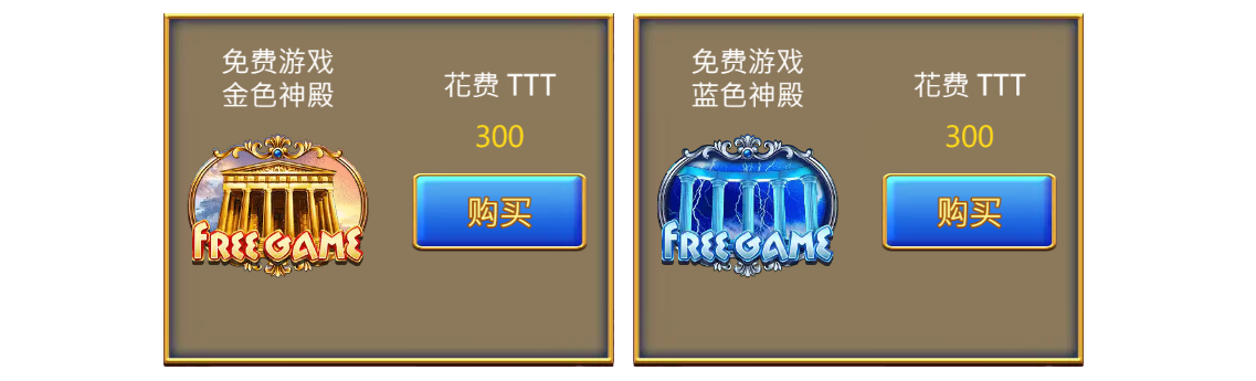 - 根據自己喜好來選擇購買的免費遊戲有「金色神殿」、「藍色神殿」兩種,以遊戲中50倍當前押注進行購買,例如:6*50=300以此類推!