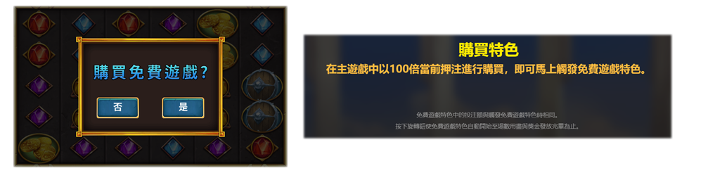 - 購買的免費遊戲特色中的押注額與觸發免費遊戲特色相同。