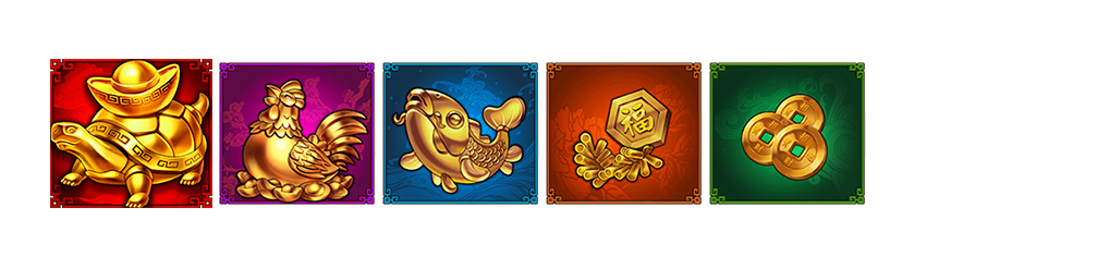 「金龜,金雞,金魚,金福,金幣」「金龜,金雞,金魚,金福,金幣」以上連線即獲得倍數獎金(所有贏分以1為投注倍數)。