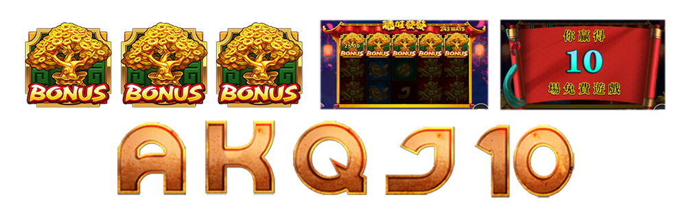 - 在任意遊戲中出現3個金樹「BONUS」時即可進入10次免費遊戲環節。