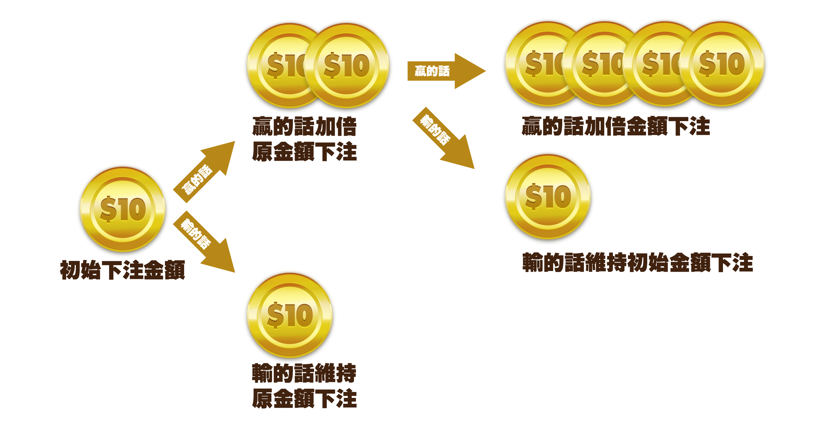 - 2.開始下注:你在每一輪中使用初始下注金額下注。如果你贏了,則將利潤加到初始下注金額上,並將總數作為下一輪的新下注金額(例如:下注10元贏了10元下次下注金額則為20元)