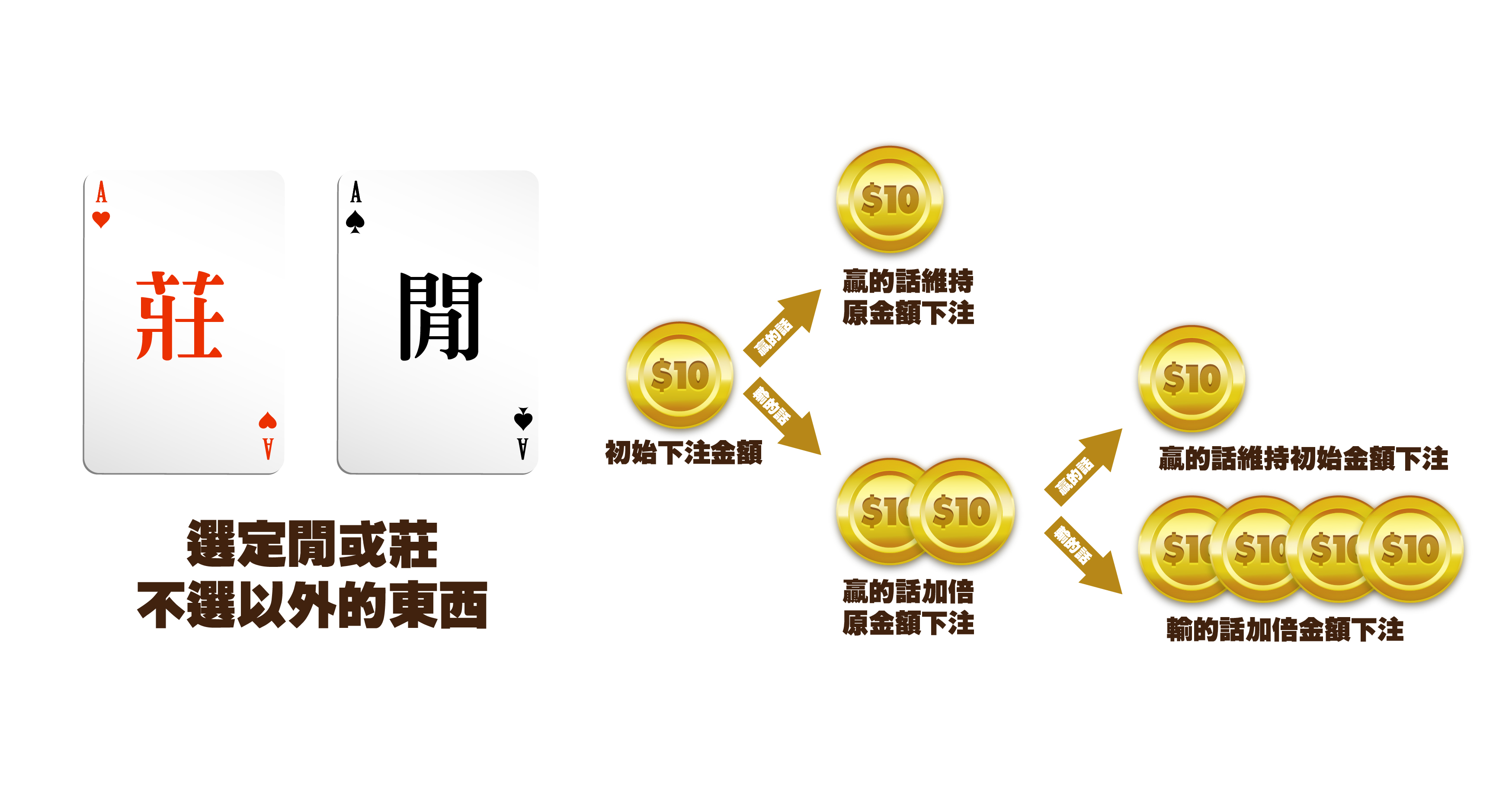 - 3.下注:你首先下注選擇的一方(例如閒或莊),如果你贏了,則回到初始下注金額,並繼續下注同一選擇。如果你輸了,則將下注金額加倍,然後繼續下注同一選擇。