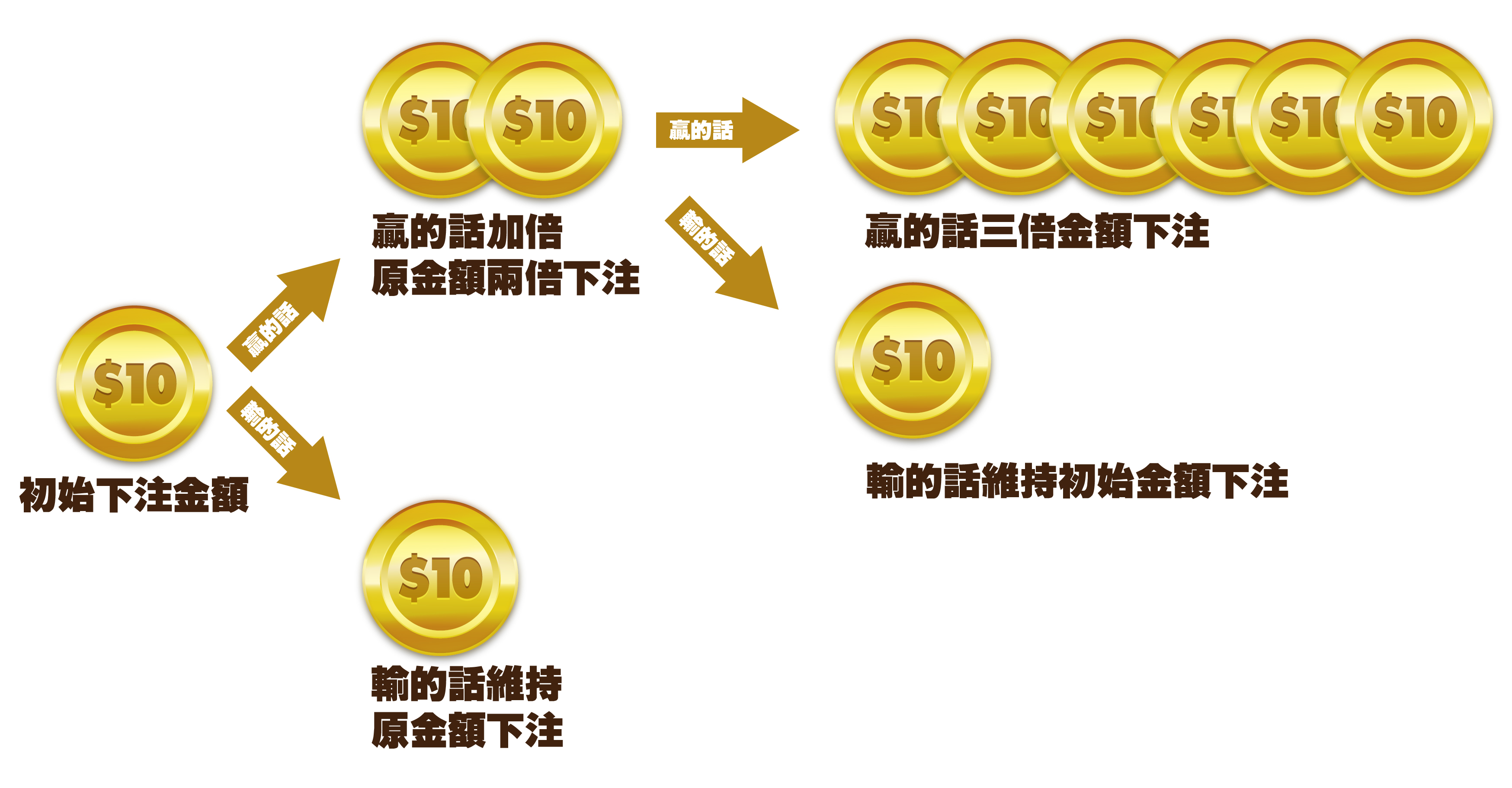- 2.開始下注:你在每一輪中使用初始下注單位下注。如果你贏了,則下一輪下注的金額是上一輪的兩倍,如果你再次贏了,則下一輪下注的金額是上一輪的三倍。