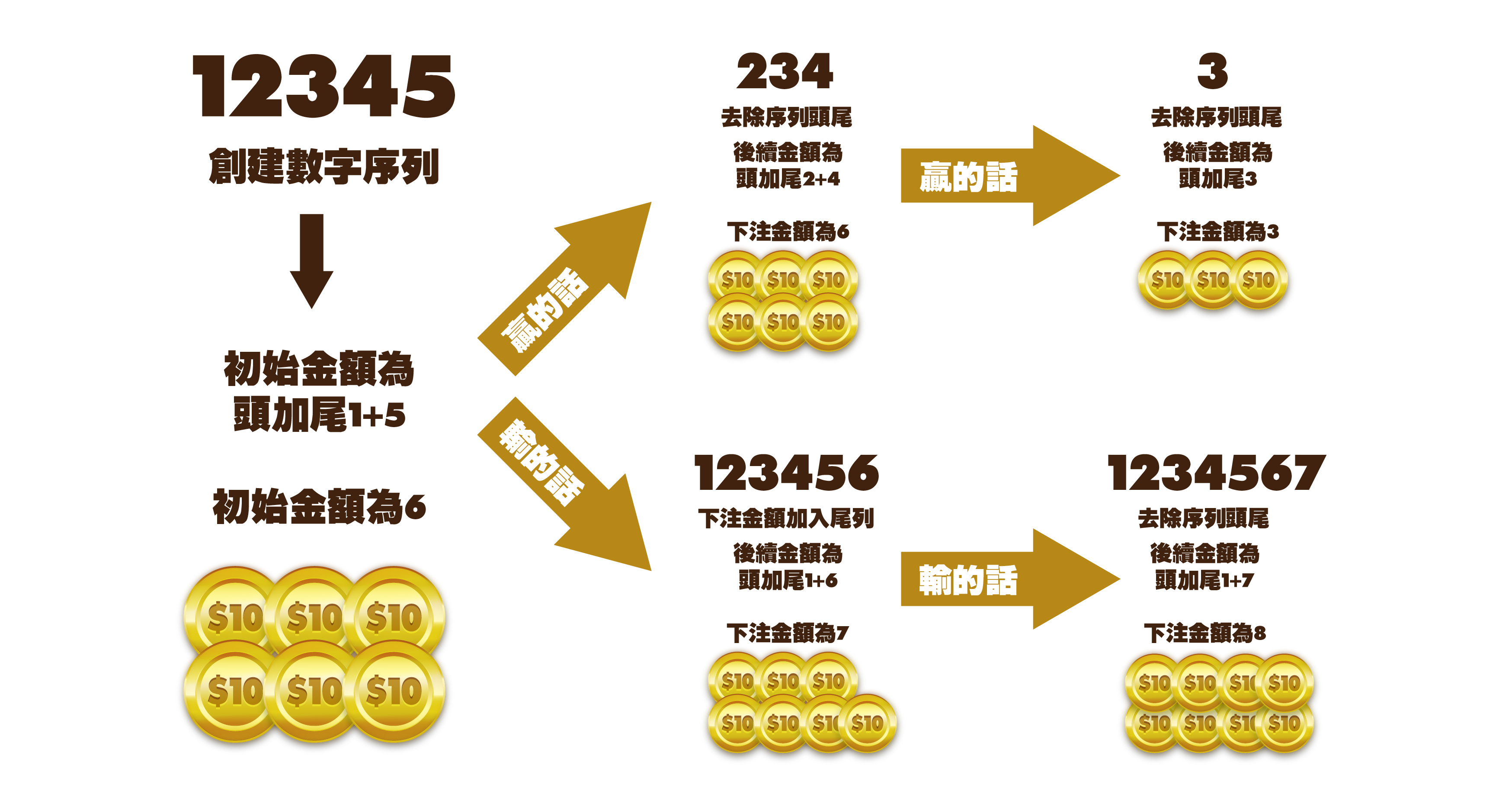 - 2.計算初始下注金額:將序列的首位和末位數字相加,並以此數字作為你的初始下注金額。例如,如果序列是1-2-3-4-5,初始下注金額為6。