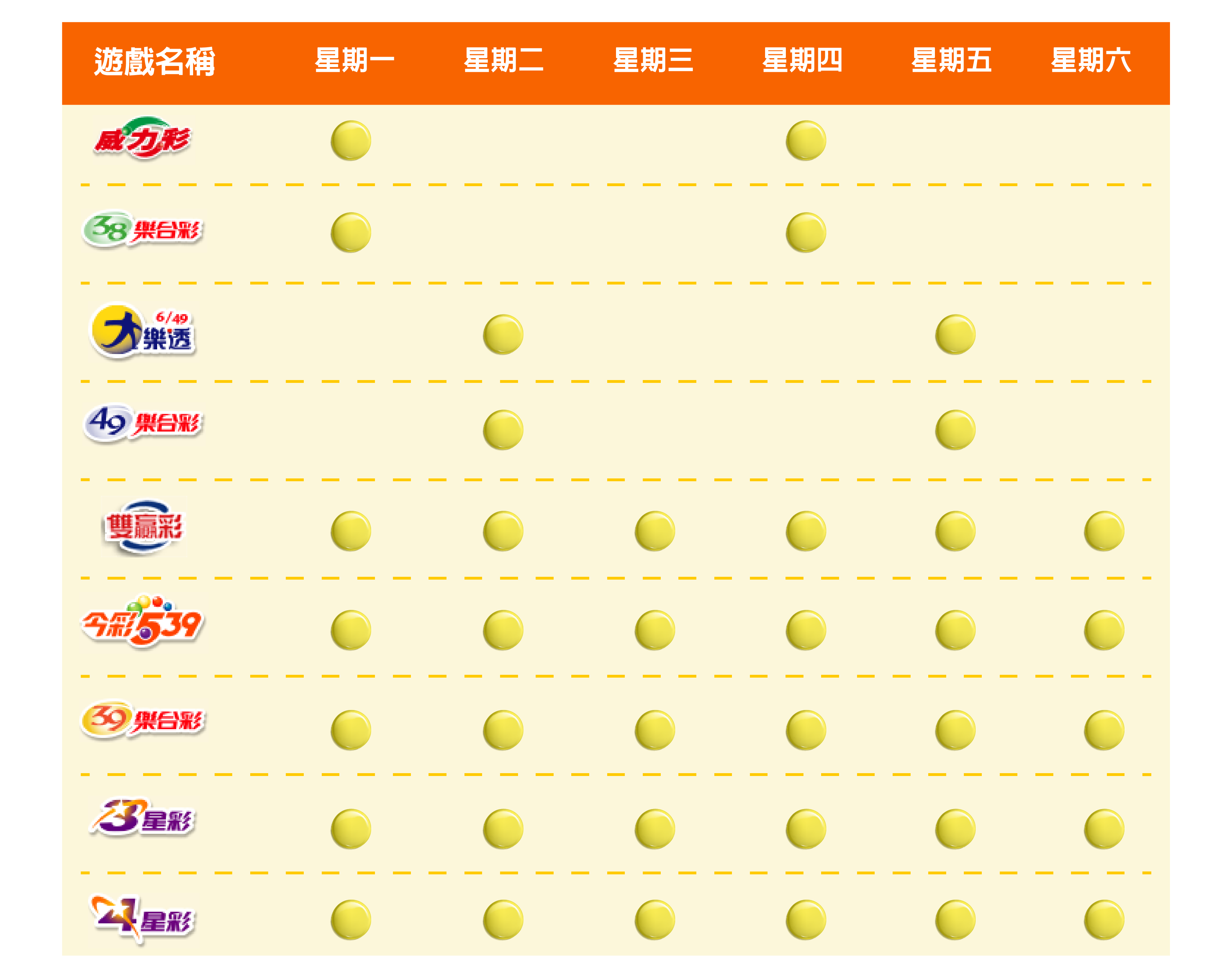 備註:開獎時間為星期一-星期六晚上八點三十分-九點。